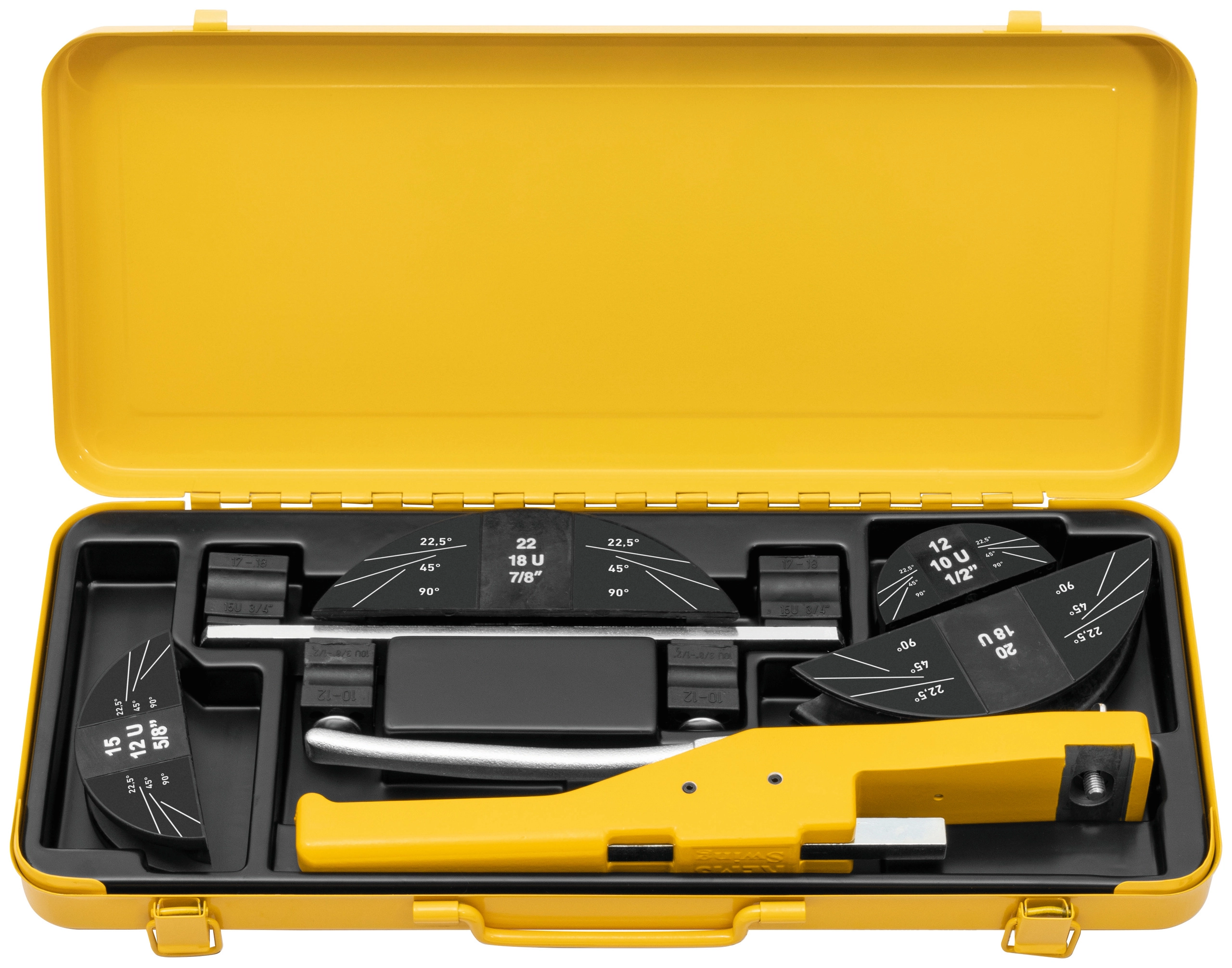 Curvatubos manual Ø 10 - 32 mm, Ø 3/8 - 7/8, hasta 90º. Hasta Ø 26 mm con dispositivo accionador, hormas de curvar, soporte para piezas deslizantes S Ø 10 - 26 mm con piezas deslizantes, en robusta caja metálica resistente/maleta. Hasta Ø 32 mm con dispositivo accionador, hormas de curvar, 2 soportes para piezas deslizantes Ø 10 - 26 mm y Ø 32 mm con piezas deslizantes, en maleta robusta.