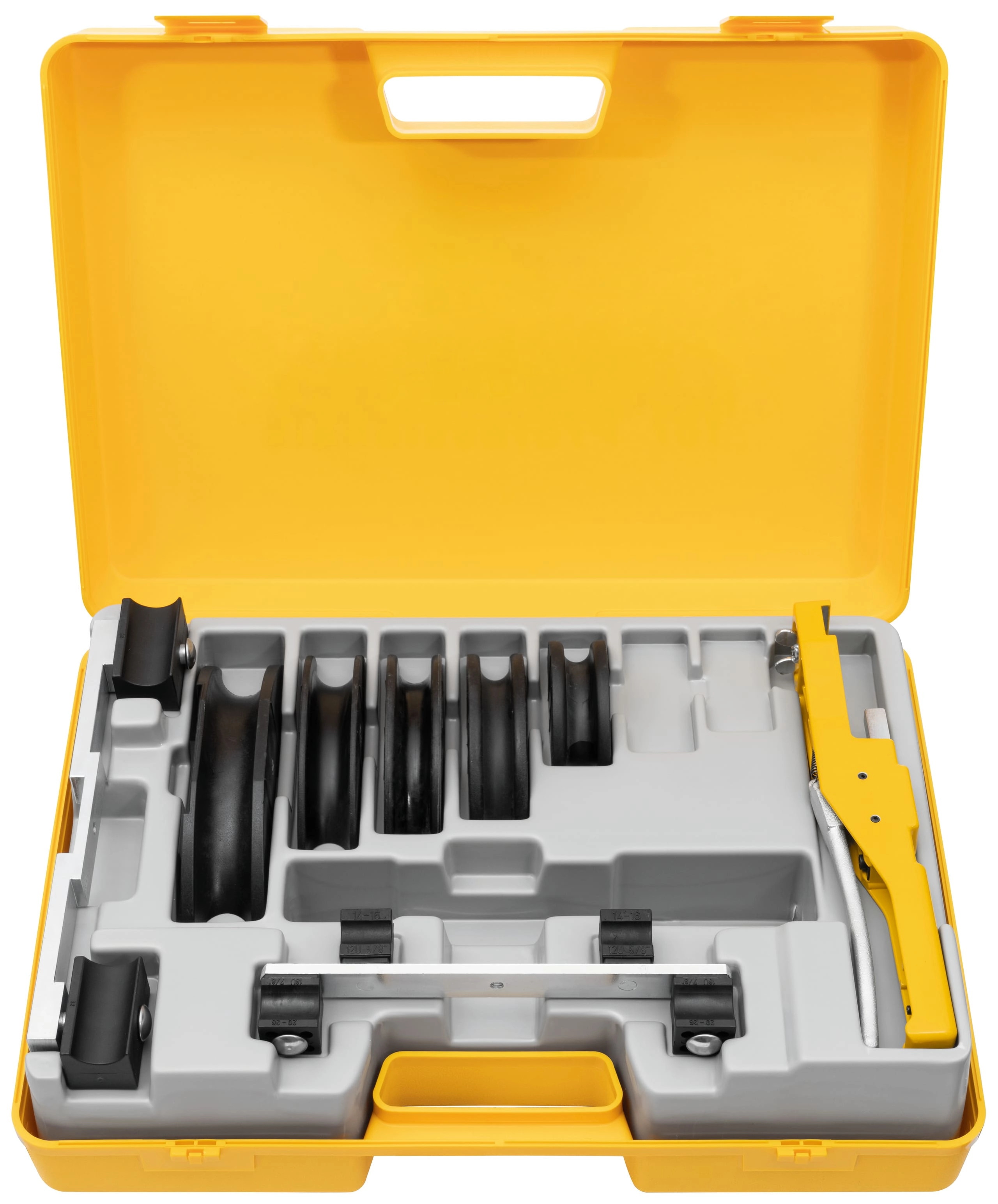 Curvatubos manual Ø 10 - 32 mm, Ø 3/8 - 7/8, hasta 90º. Hasta Ø 26 mm con dispositivo accionador, hormas de curvar, soporte para piezas deslizantes S Ø 10 - 26 mm con piezas deslizantes, en robusta caja metálica resistente/maleta. Hasta Ø 32 mm con dispositivo accionador, hormas de curvar, 2 soportes para piezas deslizantes Ø 10 - 26 mm y Ø 32 mm con piezas deslizantes, en maleta robusta.