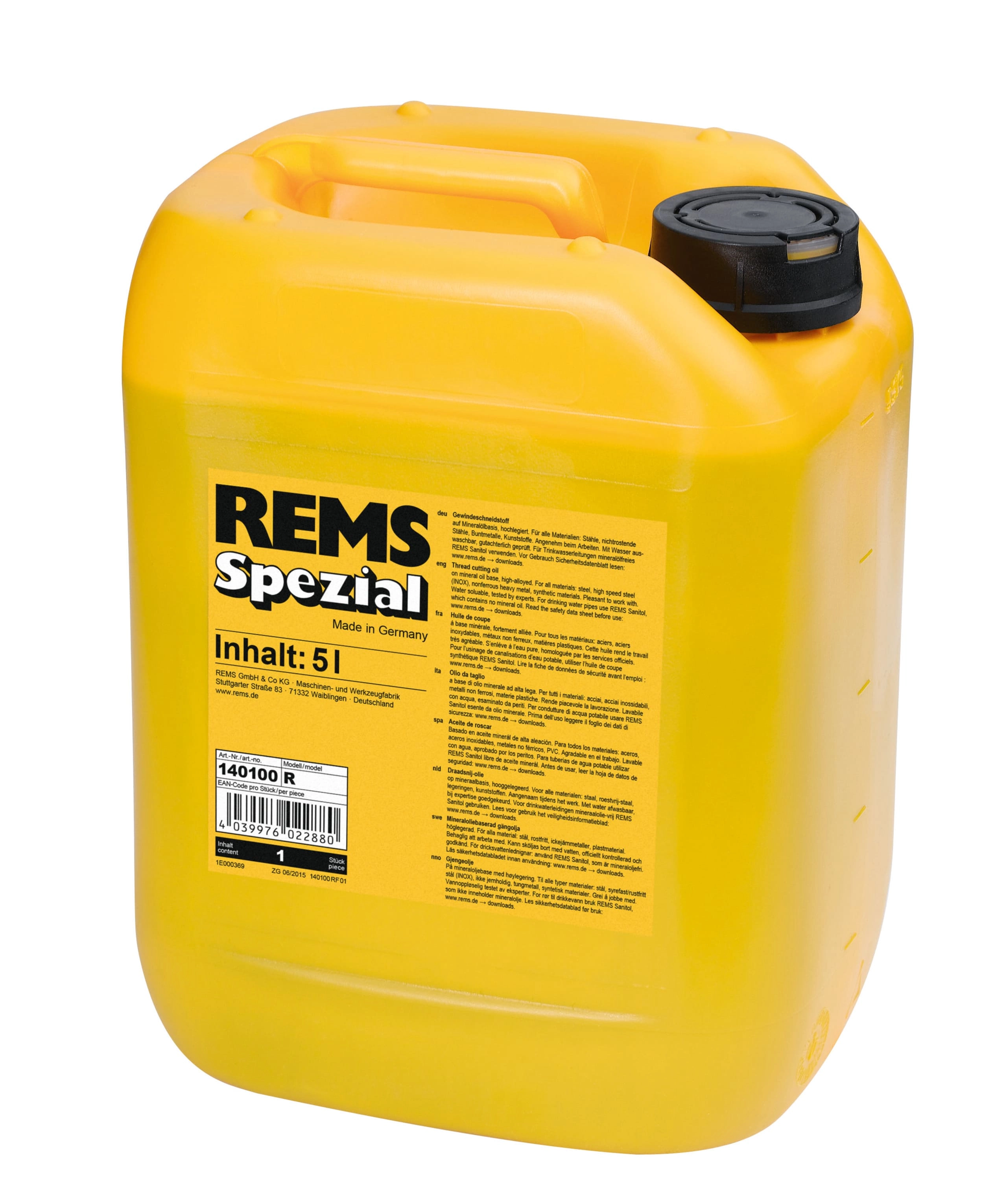 REMS Spezial - aceite de roscar de alto grado basado en aceite mineral. Evacuación mediante agua. Con gran poder lubricante y refrigerante.