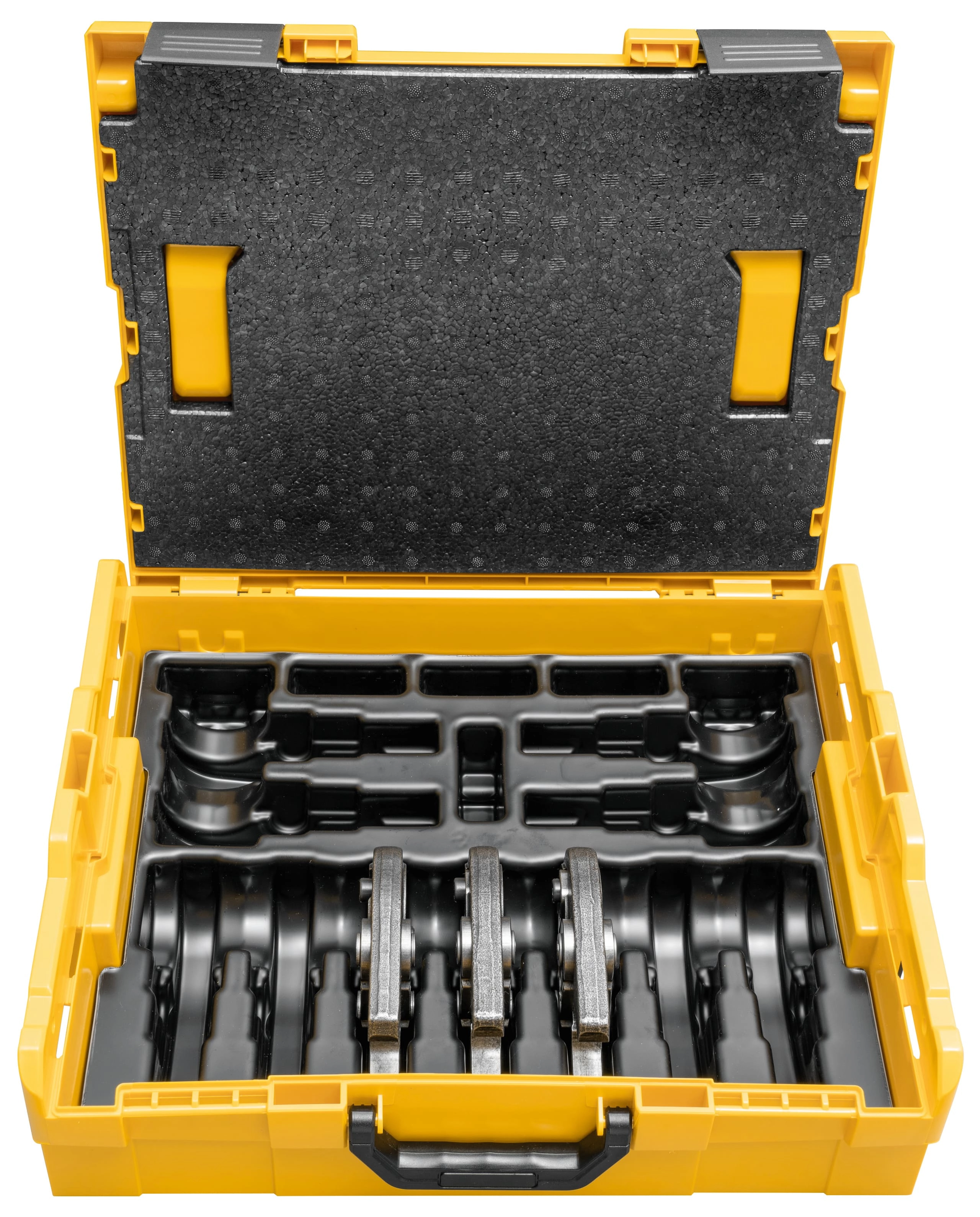 Tenazas de prensar de alta capacidad, de acero de alta tenacidad especialmente templado. Los perfiles de prensado de las tenazas de prensar Mini REMS son específicos del sistema y se corresponden con los perfiles de prensado de los correspondientes sistemas de prensar. Para un prensado impecable, seguro y en conformidad con el sistema. Mordazas prensadoras de las tenazas de prensar con perfiles de prensado mecanizados y redondeados con alta precisión en centros de mecanizado CNC. Debido a ello, reducidas tolerancias de fabricación en comparación con un contorno de prensado de fundición. Tenazas de prensar Mini en L-Boxx.