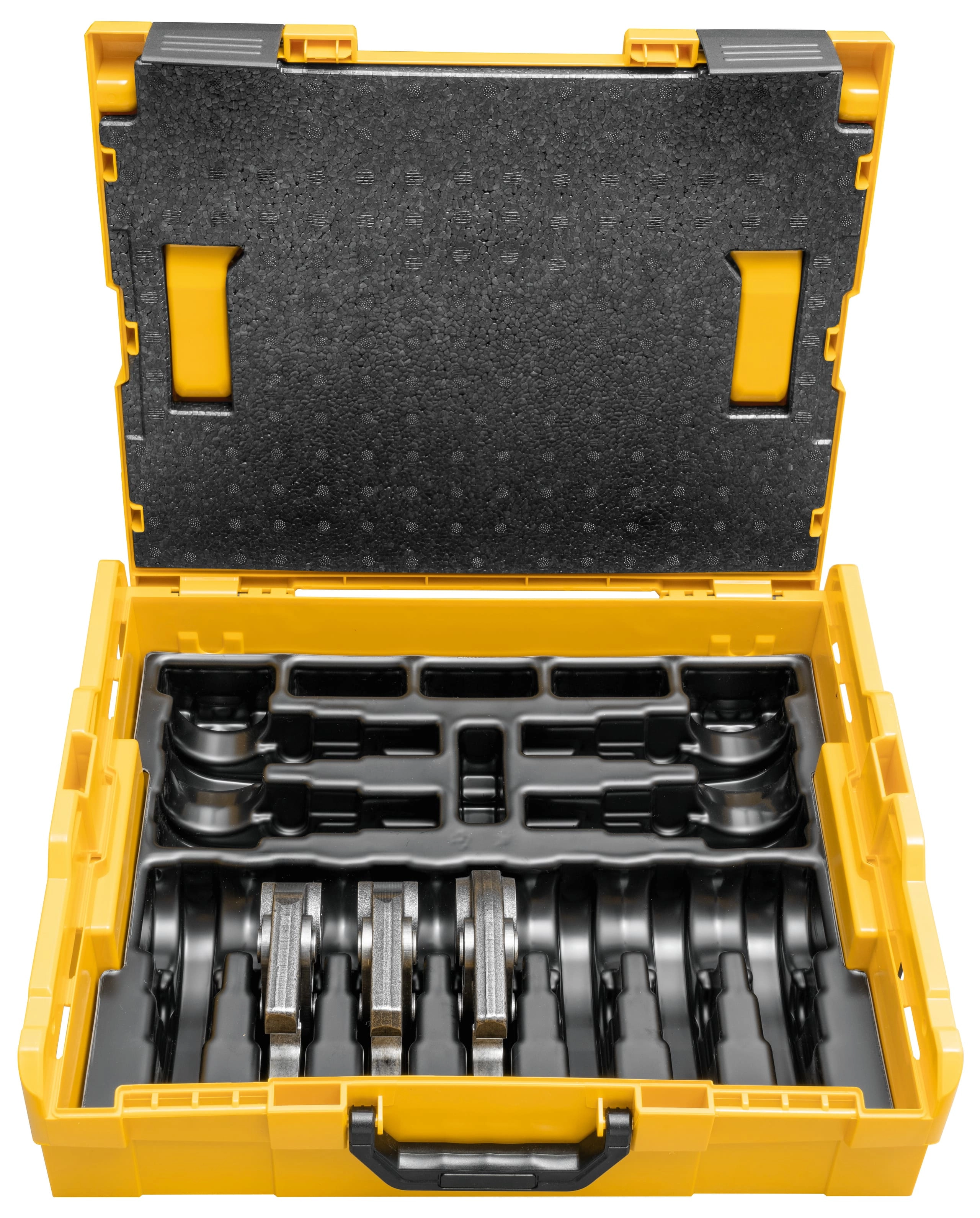 Tenazas de prensar de alta capacidad, de acero de alta tenacidad especialmente templado. Los perfiles de prensado de las tenazas de prensar Mini REMS son específicos del sistema y se corresponden con los perfiles de prensado de los correspondientes sistemas de prensar. Para un prensado impecable, seguro y en conformidad con el sistema. Mordazas prensadoras de las tenazas de prensar con perfiles de prensado mecanizados y redondeados con alta precisión en centros de mecanizado CNC. Debido a ello, reducidas tolerancias de fabricación en comparación con un contorno de prensado de fundición. Tenazas de prensar Mini en L-Boxx.